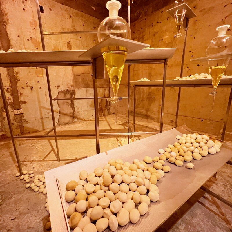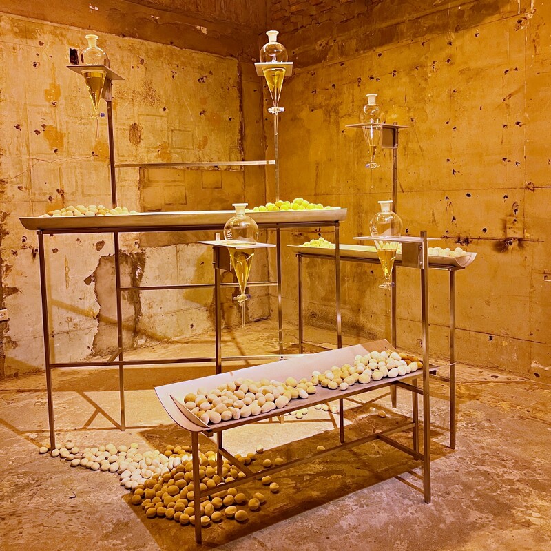 copenn.香氛装置艺术。 为了传达这个概念,品牌团队特别从泰国直运巨型香氛装置艺术来台。香氛自玻璃漏斗瓶缓缓滴落至栗子状扩香石中,象徵时间与气味的转化与沈澱,让未熟的新栗随着时间日渐成熟,也让香气流连于空间中。