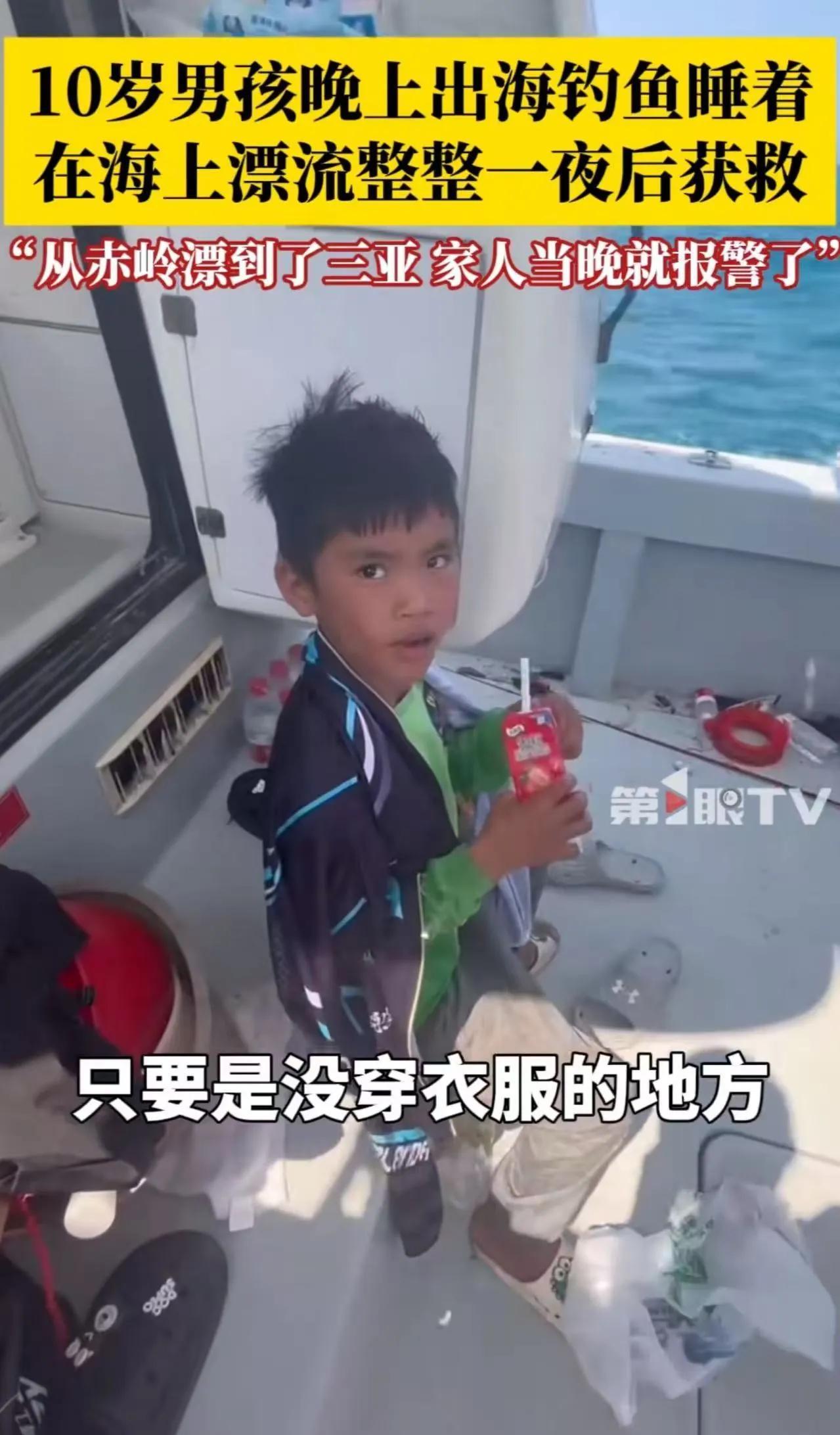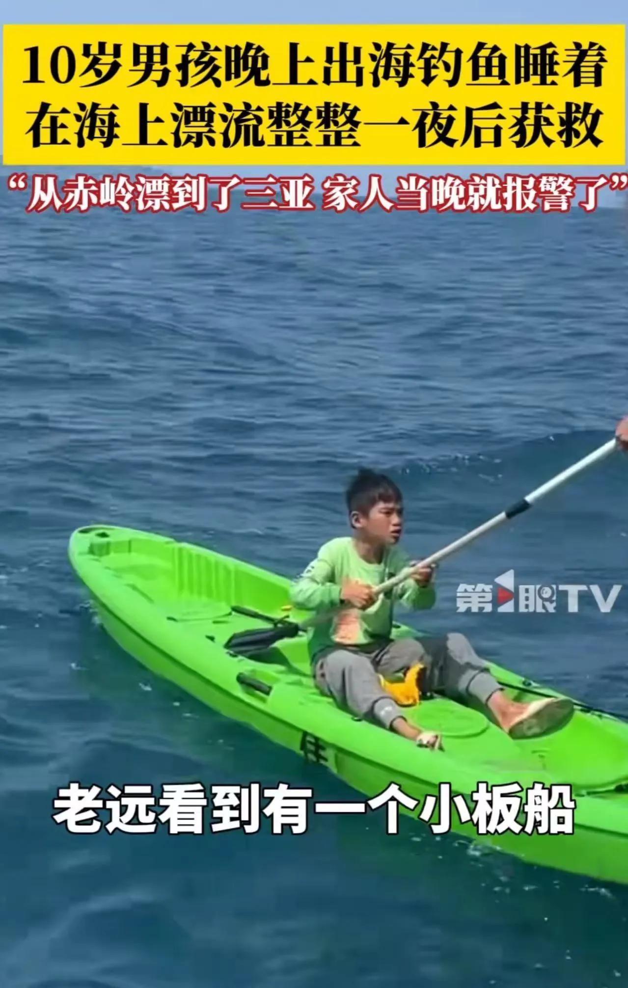 岁小男孩独自划着小船在茫茫的大海上朝着他们喊“救命”!男子以为自己出现幻觉,后来才知道男孩晚上出海钓鱼被冲走,在海上漂了一夜,从赤岭漂到三亚!!!网友:这小子可以吹一辈子了!